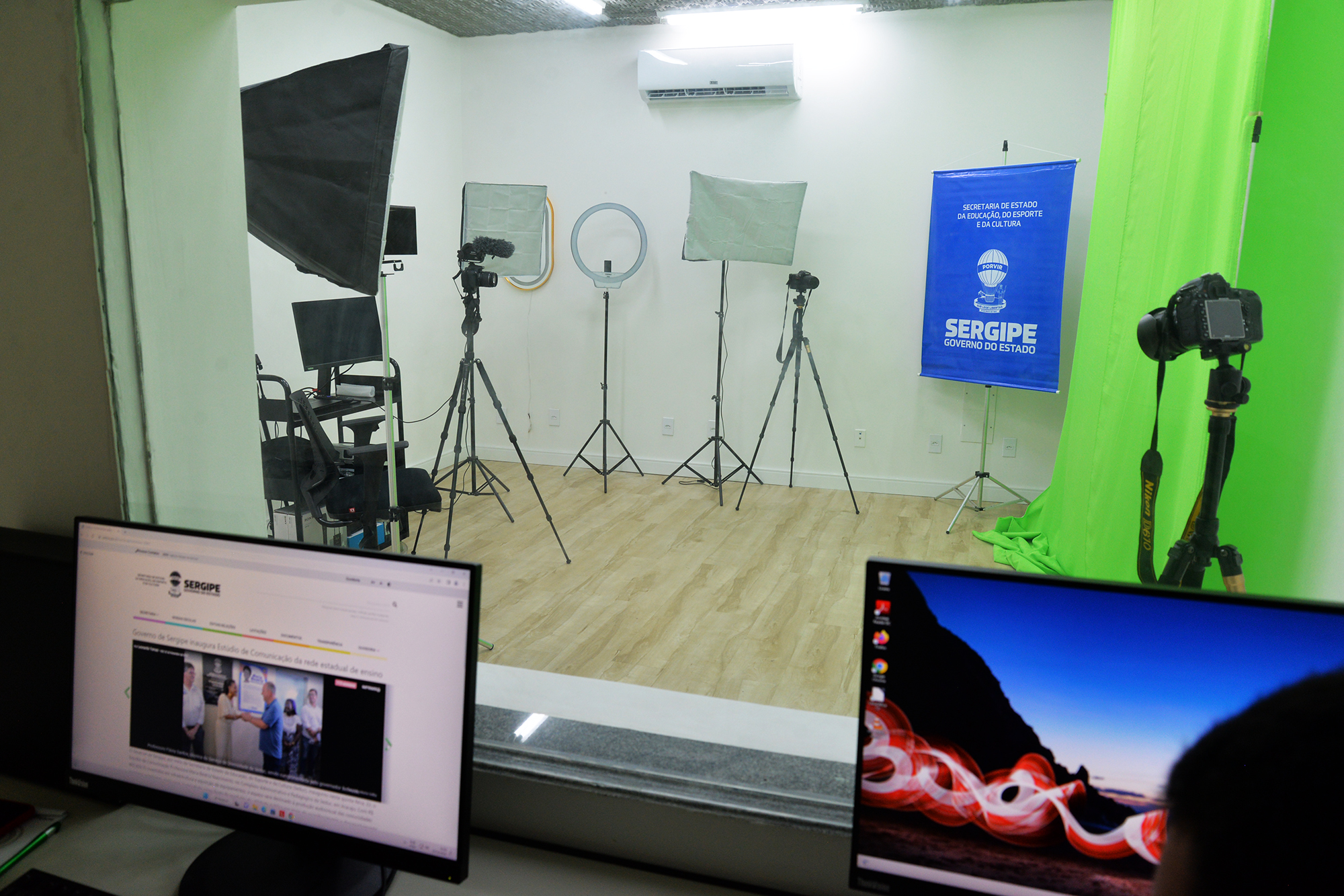 Quanto à infraestrutura, foram investidos R$ 112.645,95 na adequação e modernização de sala e construção de um estúdio de comunicação na Seduc. Em infraestrutura, foram realizadas adequações na parte elétrica e de iluminação, execução de paredes de 30cm de gesso acartonado com lã de vidro, revestido com tecidos pretos para isolamento acústico, com teto de absorvedor acústico Sonex, portas acústicas, instalação de visores com cabeamento estruturado, instalação de tubulações em PVC para sonorização de vídeo, revisão de esquadrias de alumínio com vidro e aplicação de película Insulfilm.