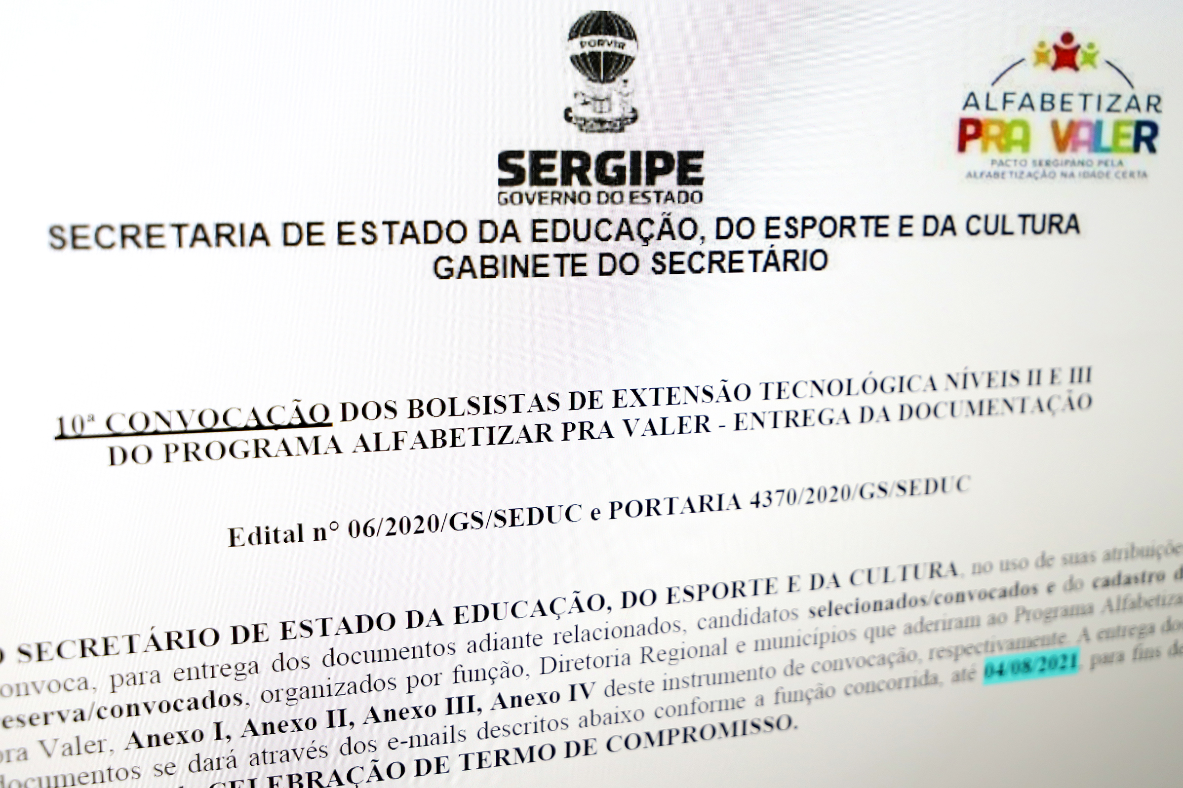 A Secretaria de Estado da Educação, do Esporte e da Cultura (Seduc) torna pública a 10ª convocação dos bolsistas de extensão tecnológica nos níveis I, II e III do programa Alfabetizar pra Valer, respectivamente, coordenador municipal, formador municipal e formador na Diretoria Regional de Educação. Os selecionados devem entregar os documentos, por meio dos e-mails informados, até o dia 4 de agosto para finalizar a celebração do Termo de Compromisso.