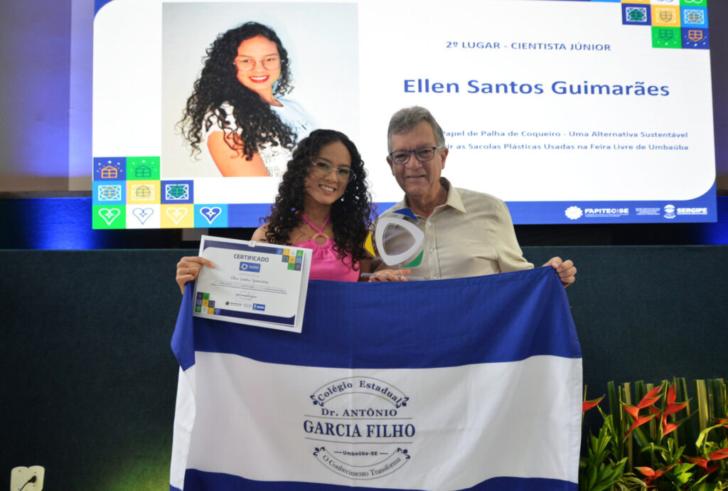 O 2º lugar foi para a aluna do Colégio Estadual Doutor Antônio Garcia Filho, Ellen Santos Guimarães, com a pesquisa ‘Ecobags de papel de palha de coqueiro – uma alternativa sustentável para substituir as sacolas plásticas usadas na Feira Livre de Umbaúba’. O trabalho foi orientado pela professora Darcylaine Vieira Martins e contou com a participação de outras duas jovens cientistas: Iulânia Firmino dos Santos e Sofhia Gabrielly Araújo Santana.