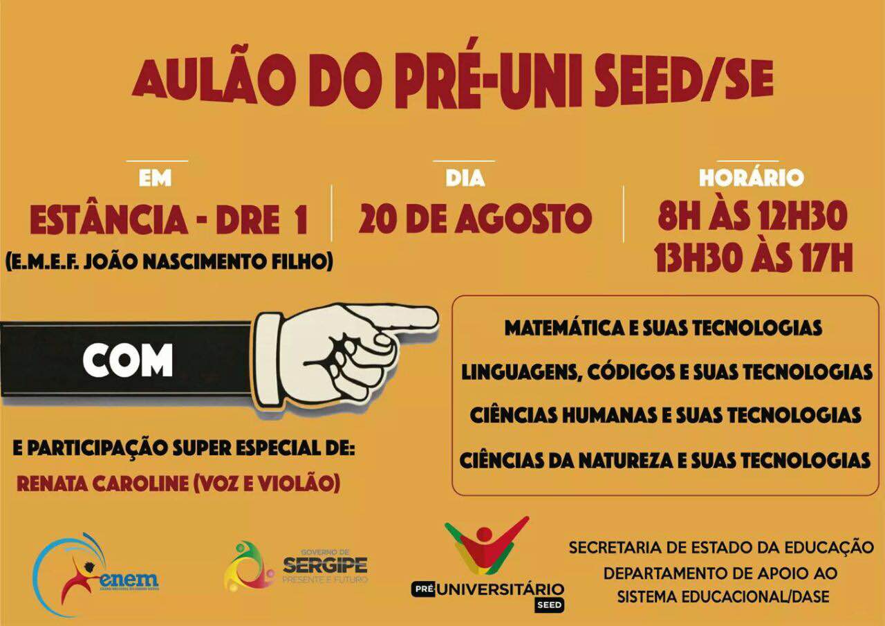 A Secretaria de Estado da Educação, através do Departamento de Apoio ao Sistema Educacional (Dase), realizará o Aulão Pré-Uni Seed na Escola Municipal João Nascimento Filho, das 8h às 12h30 e das 13h30 às 17h.