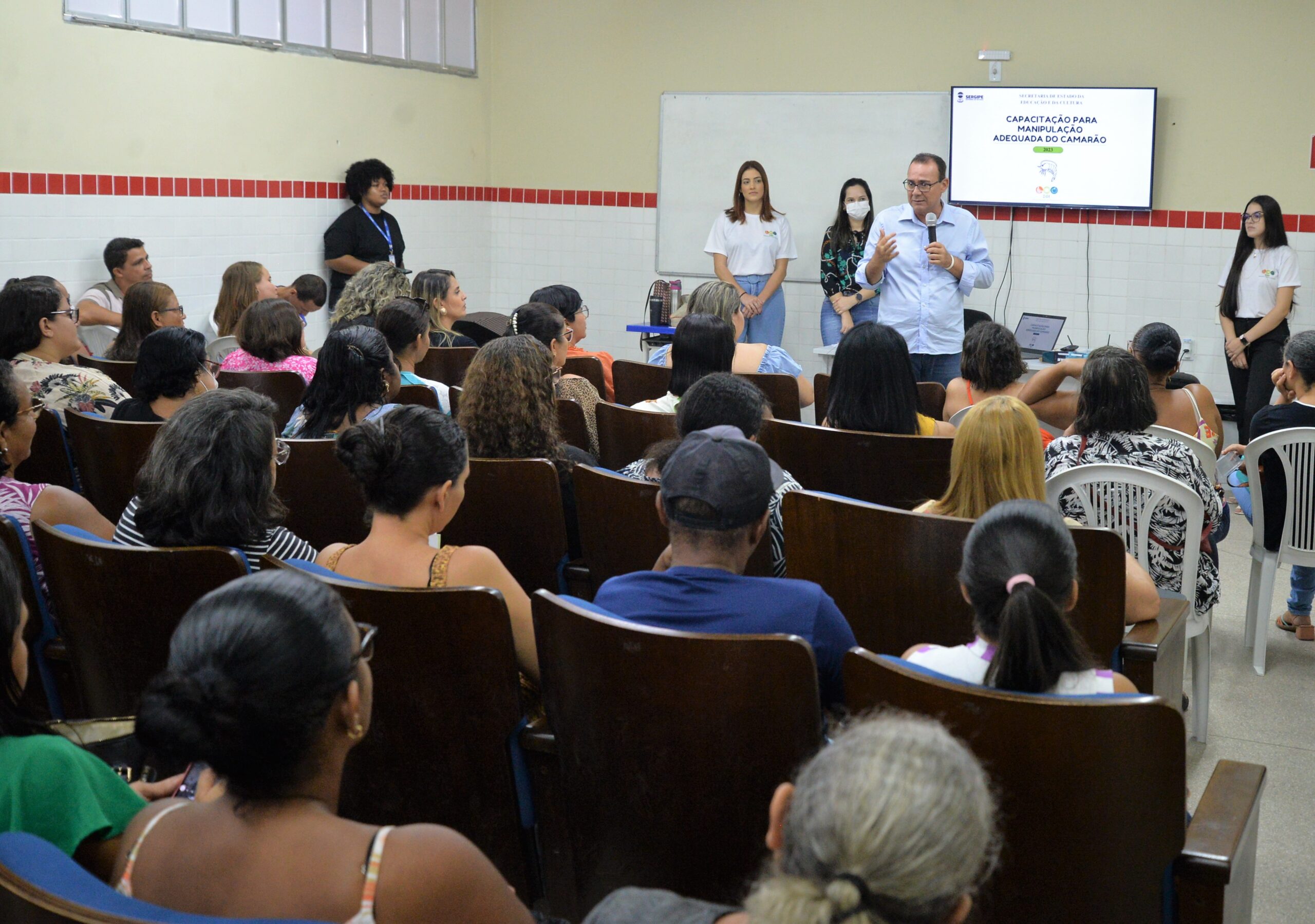 Merendeiros de 21 escolas de Aracaju participaram da capacitação com técnicos do Departamento de Alimentação Escolar da Seduc, que transmitiram informações sobre os valores nutricionais do camarão, o armazenamento adequado, a manipulação e as opções de cardápio de acordo com o já oferecido, além de como evitar reações alérgicas e o que fazer se se depararem com algum caso.