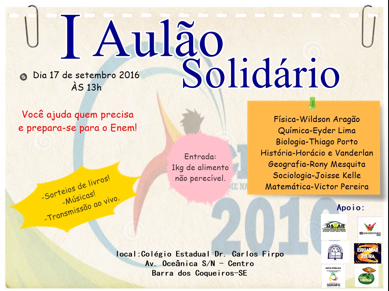 O Colégio Estadual Dr. Carlos Firpo, localizado no município de Barra dos Coqueiros, promove neste sábado, 17, às 13h, o Iº Aulão Solidário, destinado aos alunos que irão participar do ENEM.