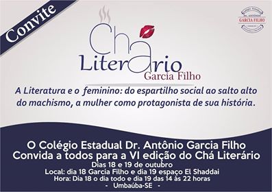 Por Ítalo Marcos Fonte: ASCOM / SEED Nos dias 18 e 19 deste mês de outubro acontecerá no Colégio Estadual Dr. Antônio Garcia Filho, em Umbaúba, a VI edição do Chá Literário. Neste ano, o tema do evento é "Literatura e o feminino: do espartilho social ao salto alto do