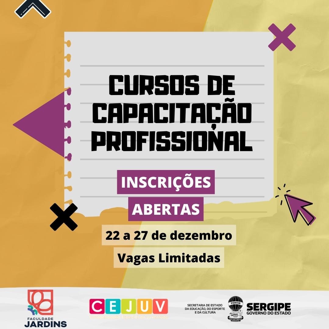 A Secretaria de Estado da Educação, do Esporte e da Cultura (Seduc), por meio da Coordenadoria Especial de Juventude (Cejuv), até o dia 27 de dezembro, está com inscrições abertas para 5.000 vagas em cursos de capacitação profissional gratuitas na modalidade online, em parceria com a Faculdade Jardins, cujas atividades serão realizadas entre os meses de dezembro e janeiro. Os interessados precisam ter idade acima de 15 anos.