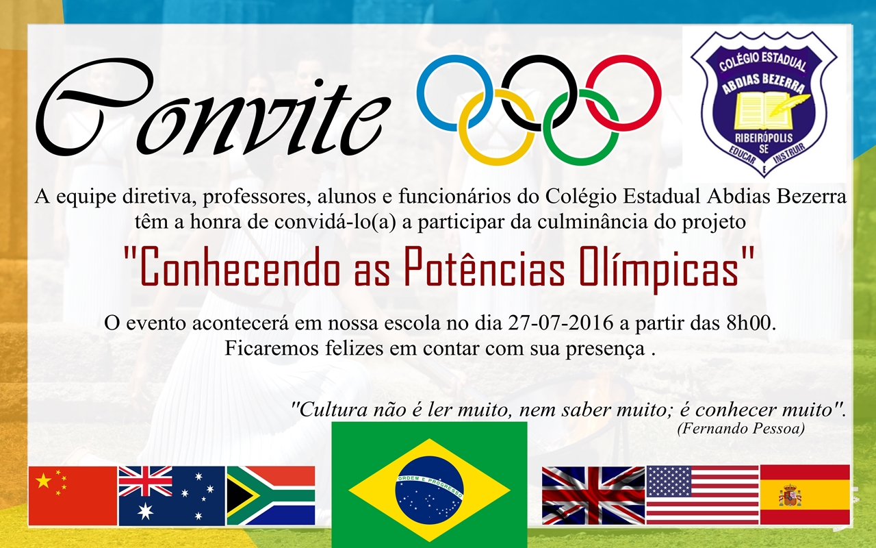 Durante todo o dia da próxima quarta-feira, 26, a equipe diretiva e pedagógica e os estudantes do Colégio Estadual Abdias Bezerra, localizado no município de Ribeirópolis, realizam o Projeto Conhecendo as Potências Olímpicas 2016.