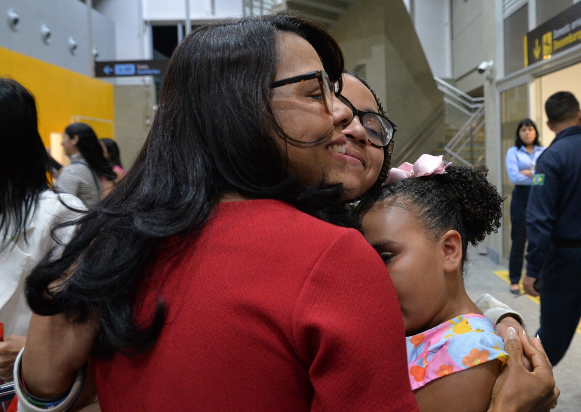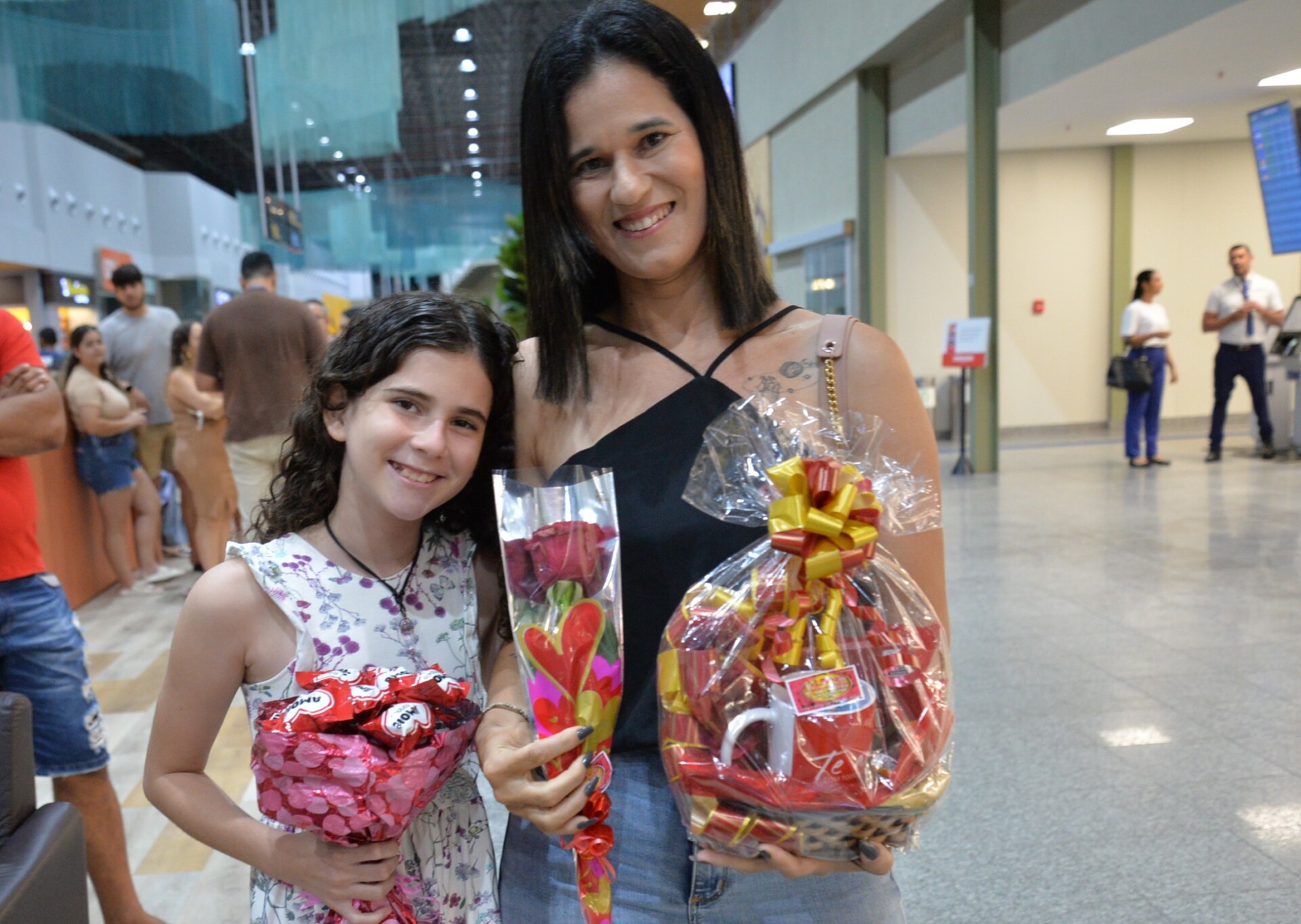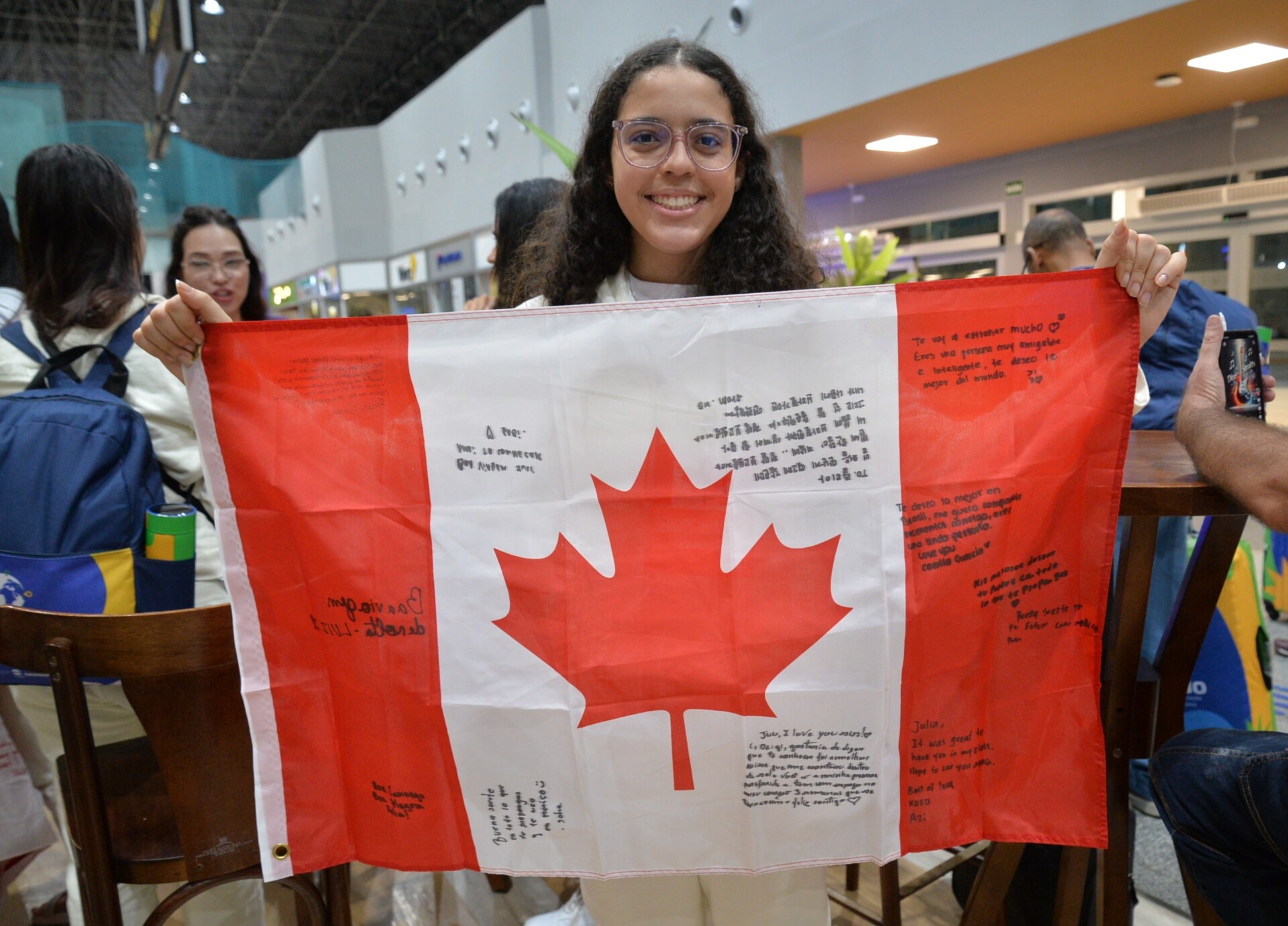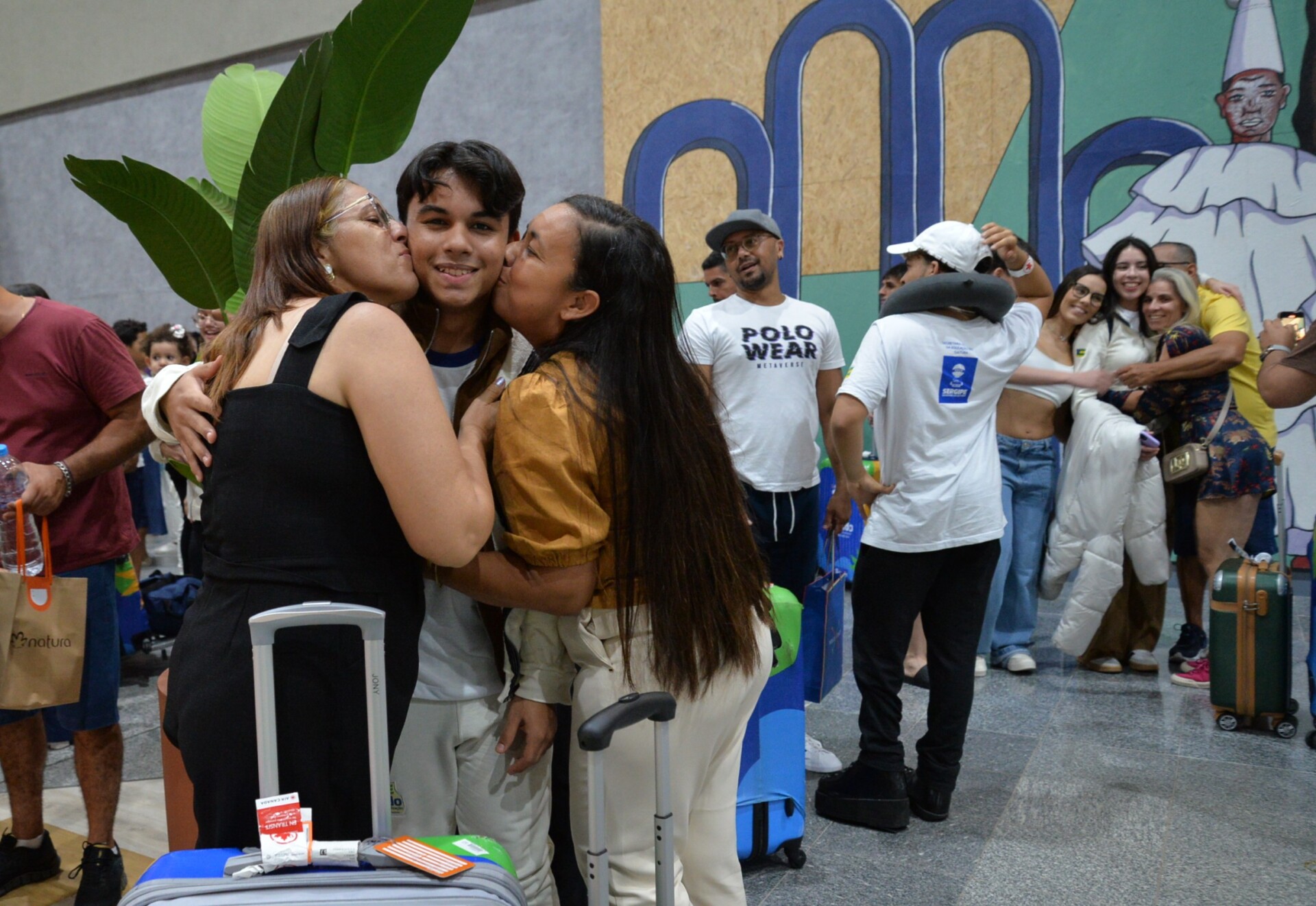 A mãe Juliana de Faria chegou com a filha Ayla Faria com um buquê de flores, bombons e presentes. Ayla ensaiou o abraço que daria na irmã, Jhulia Faria, estudante do Colégio Estadual Abelardo Barreto, em Tobias Barreto. “Foi um mês lento, de muita saudade. Ela nunca tinha viajado só, mas acho que volta com mais experiência de vida, mais madura. É um aprendizado muito bom, nova visão do mundo, até porque ela completou 16 anos lá no Canadá”, disse a mãe.