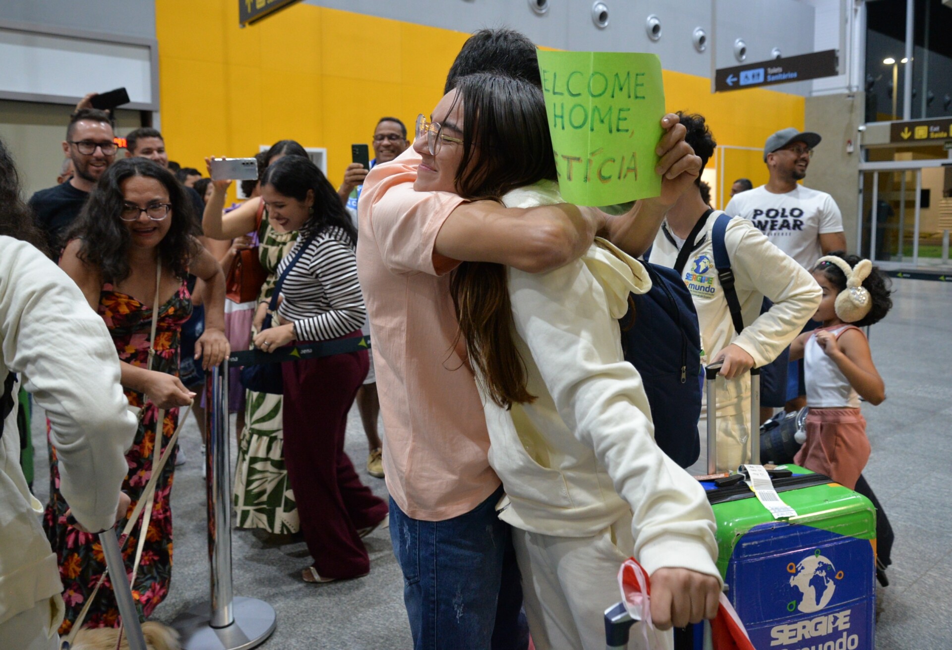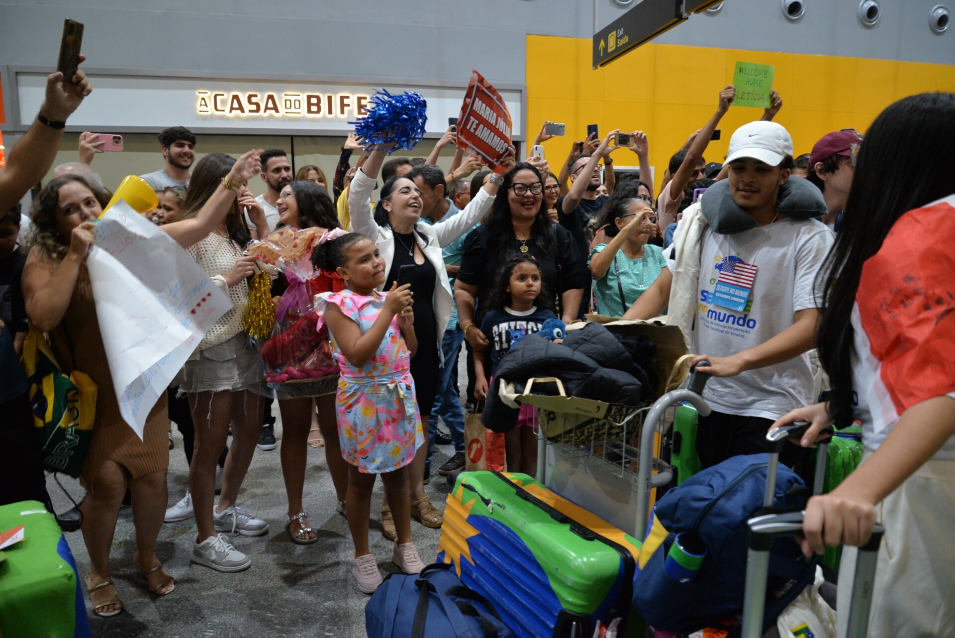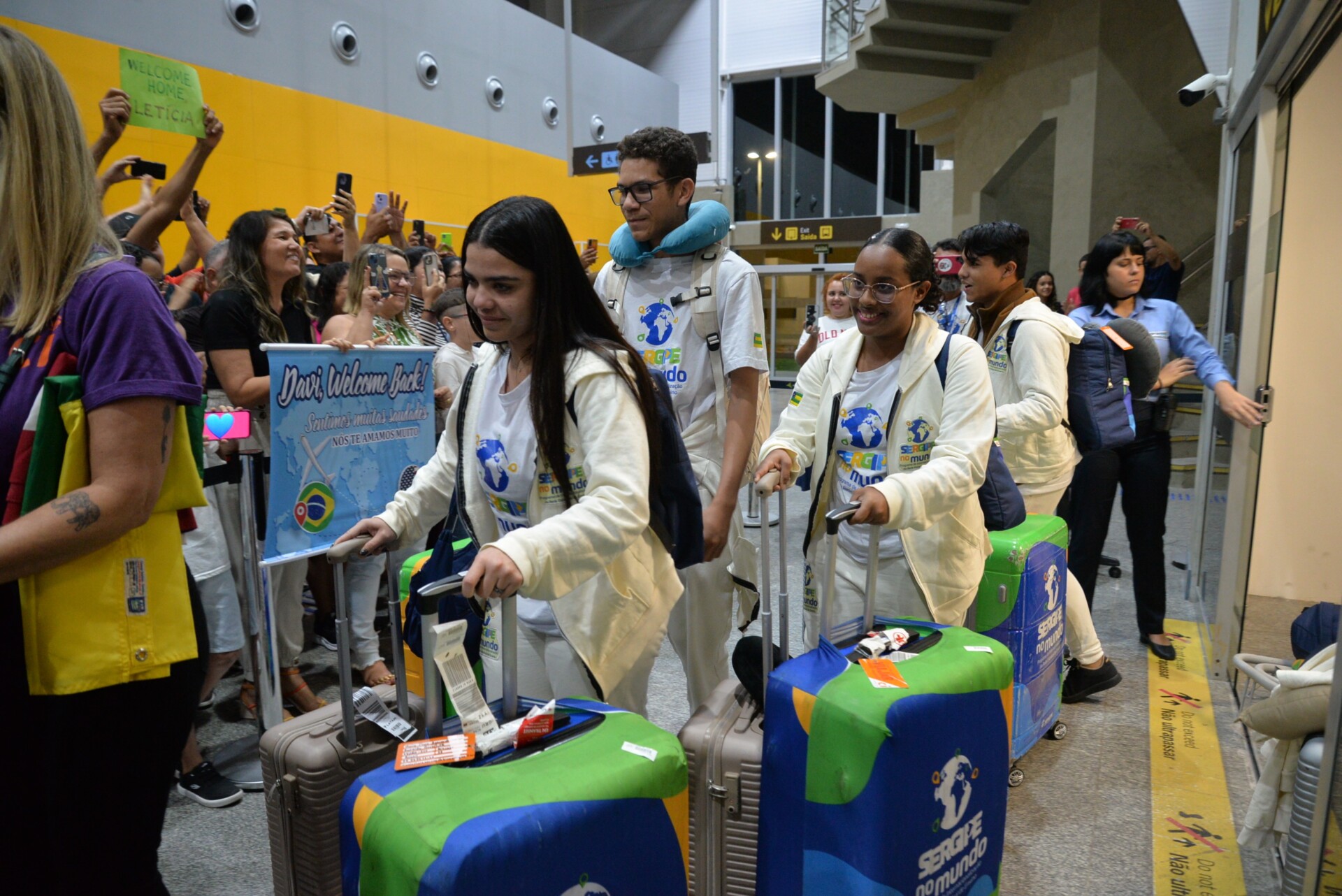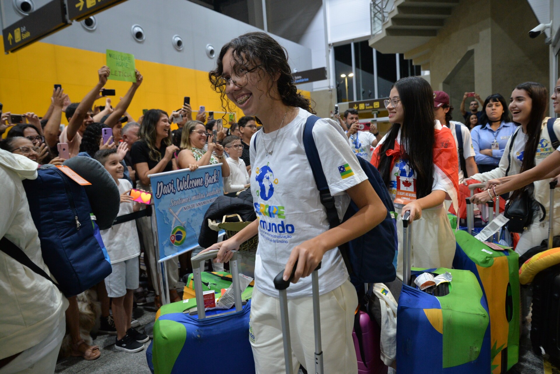O portão de desembarque ficou pequeno, tamanha a quantidade de amigos e familiares que prestigiaram a chegada histórica da segunda turma do programa de intercâmbio do Governo de Sergipe, destinado aos estudantes da rede pública estadual. Os cartazes, presentes, flores e mimos representaram a saudade e a expectativa da chegada.