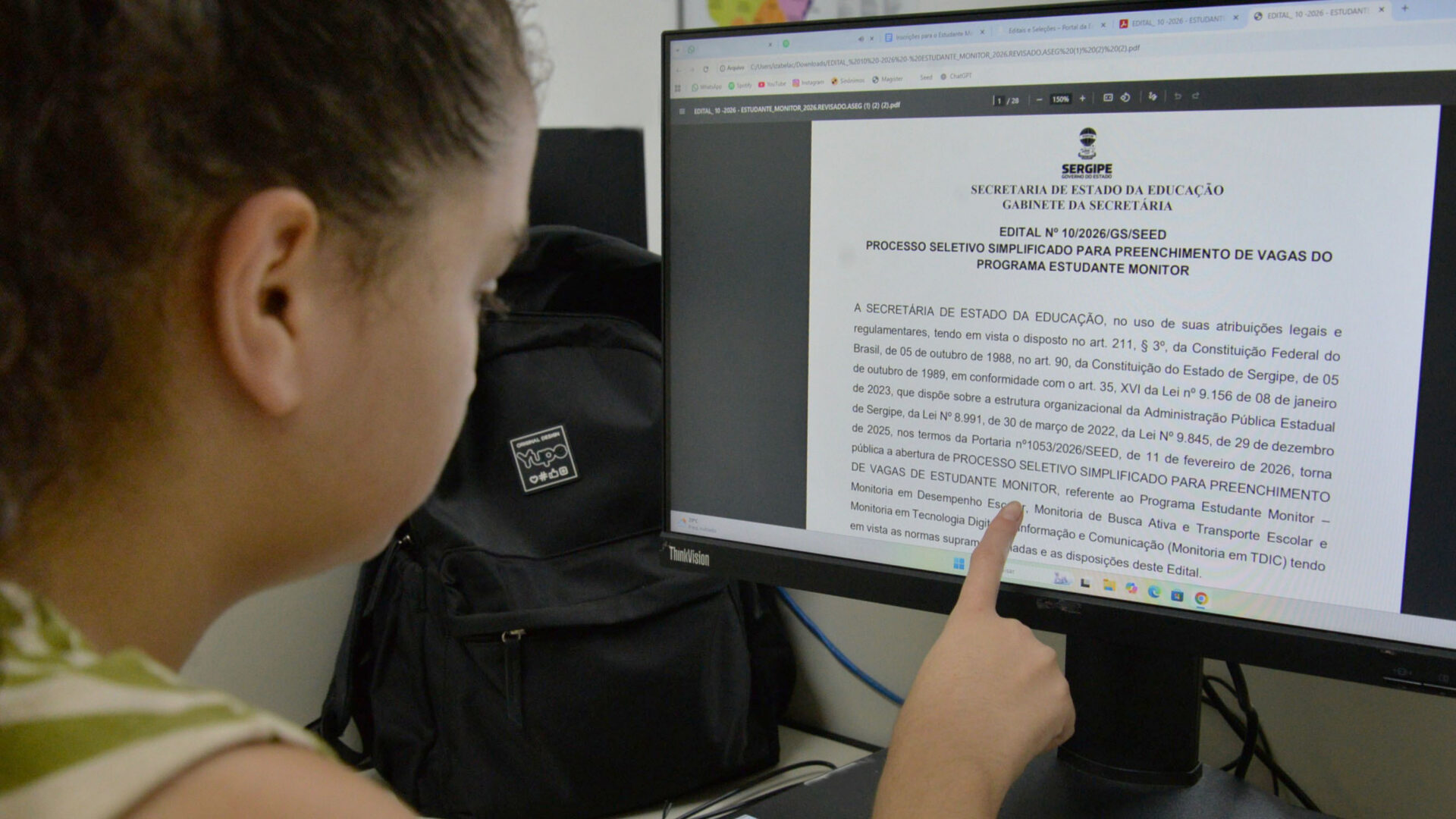 O Governo de Sergipe, por meio da Secretaria de Estado da Educação (Seed), torna pública a abertura do Processo Seletivo Simplificado para o Programa Estudante Monitor, com inscrições abertas de 3 a 6 de março. De caráter classificatório, a seleção é destinada a estudantes do 9º ano e Ensino Médio, de todas as modalidades de ensino, matriculados na rede pública estadual de ensino.