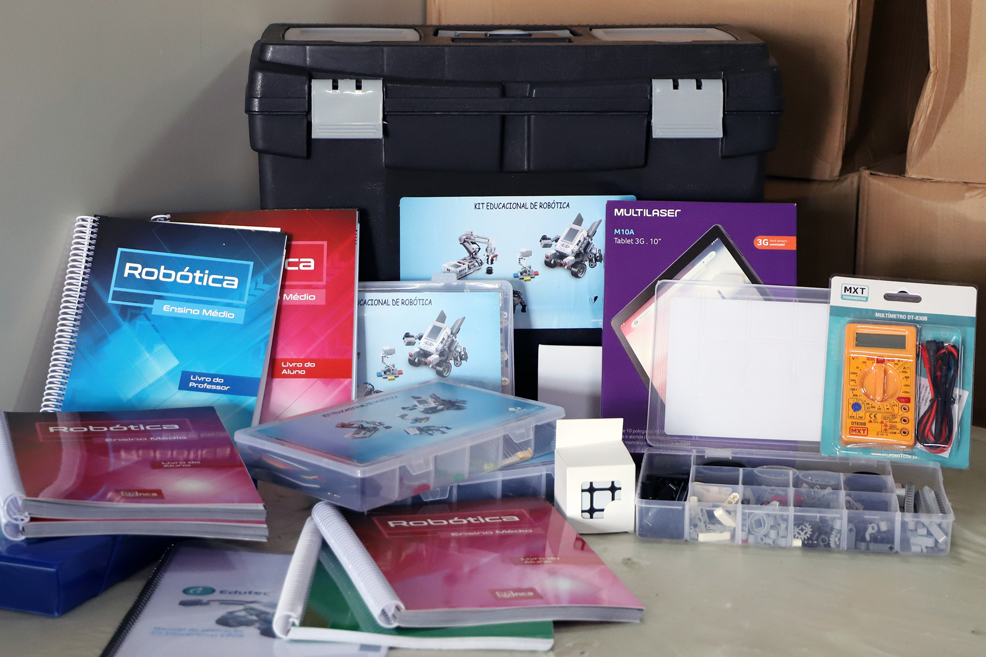 O material ainda conta com Laboratório de Robótica, maleta que traz o conjunto de ensino técnico, robô de simulação industrial de processo de carga e transporte; Sistema Digitais de Controle e Automação com plataforma para estudos em microcontrolador microchip, plataforma para estudo de programação de microcontroladores, osciloscópio digital, gerador de funções digitais, regulador de voltagem varuac monofásico, multímetro digital, protoboard e maleta de ferramenta com 18 peças.