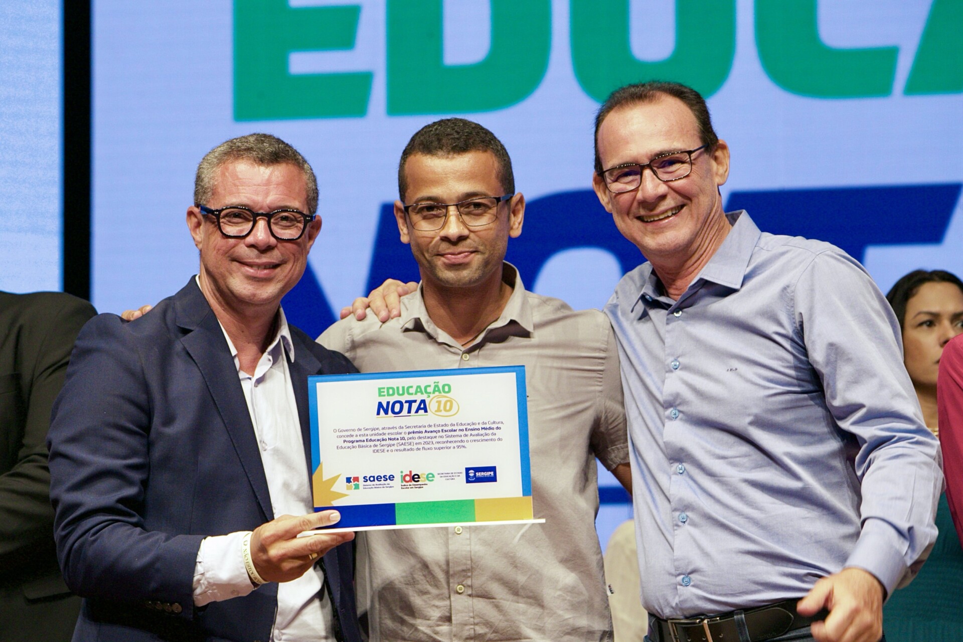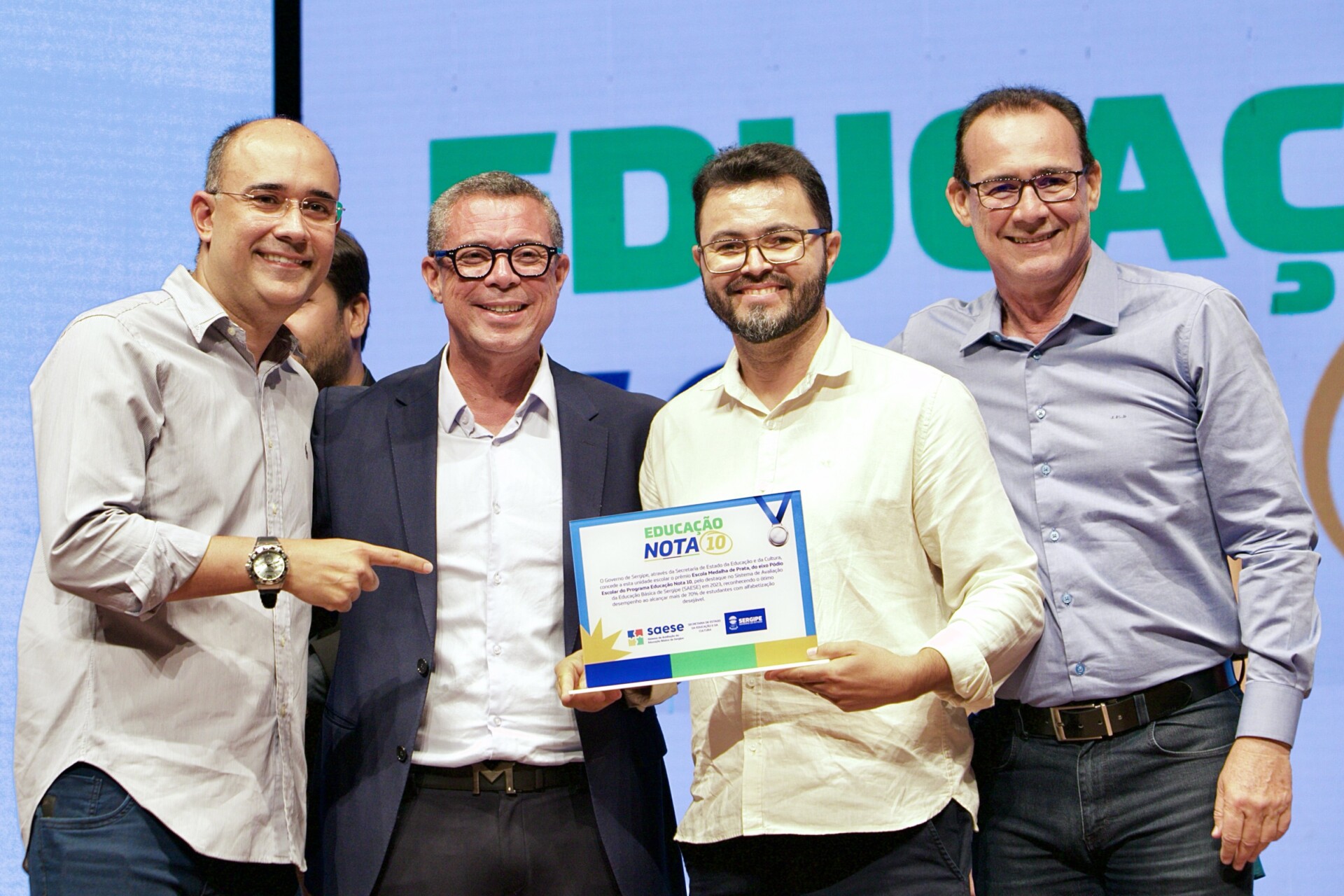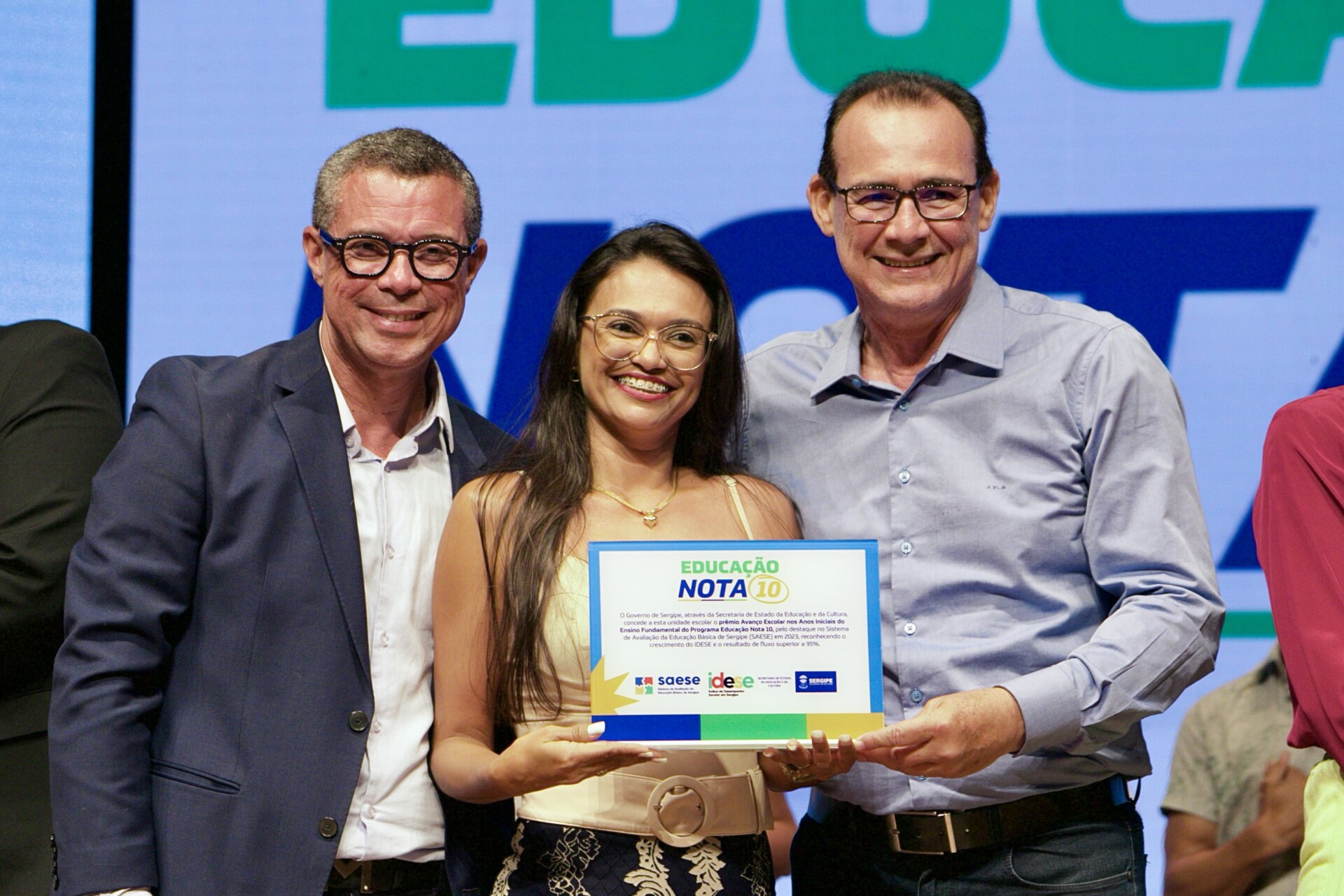 O Programa Educação Nota 10 contempla professores e servidores com base no desempenho obtido pelas escolas e Diretorias de Educação no Sistema de Avaliação da Educação Básica de Sergipe (Saese). Neste ano, foram premiadas as escolas nos eixos Pódio e Avanço Escolar, em quatro etapas: alfabetização, para professores 1º e 2º anos do ensino fundamental e equipe diretiva; anos iniciais do ensino fundamental; anos finais do ensino fundamental; e ensino médio, sendo todas destinadas aos professores e servidores da escola premiada.