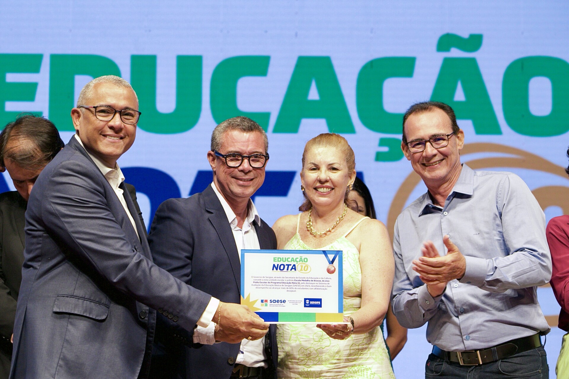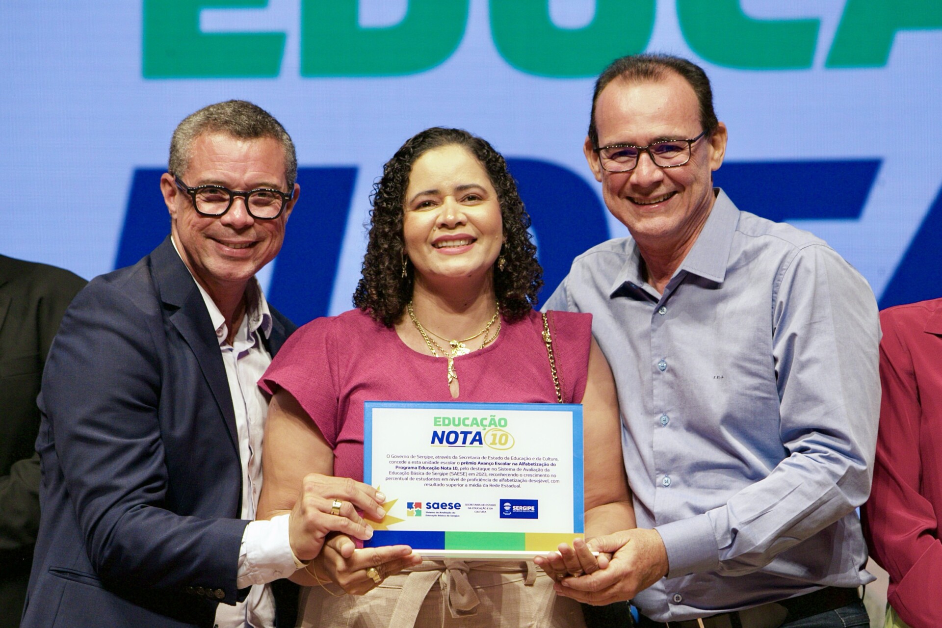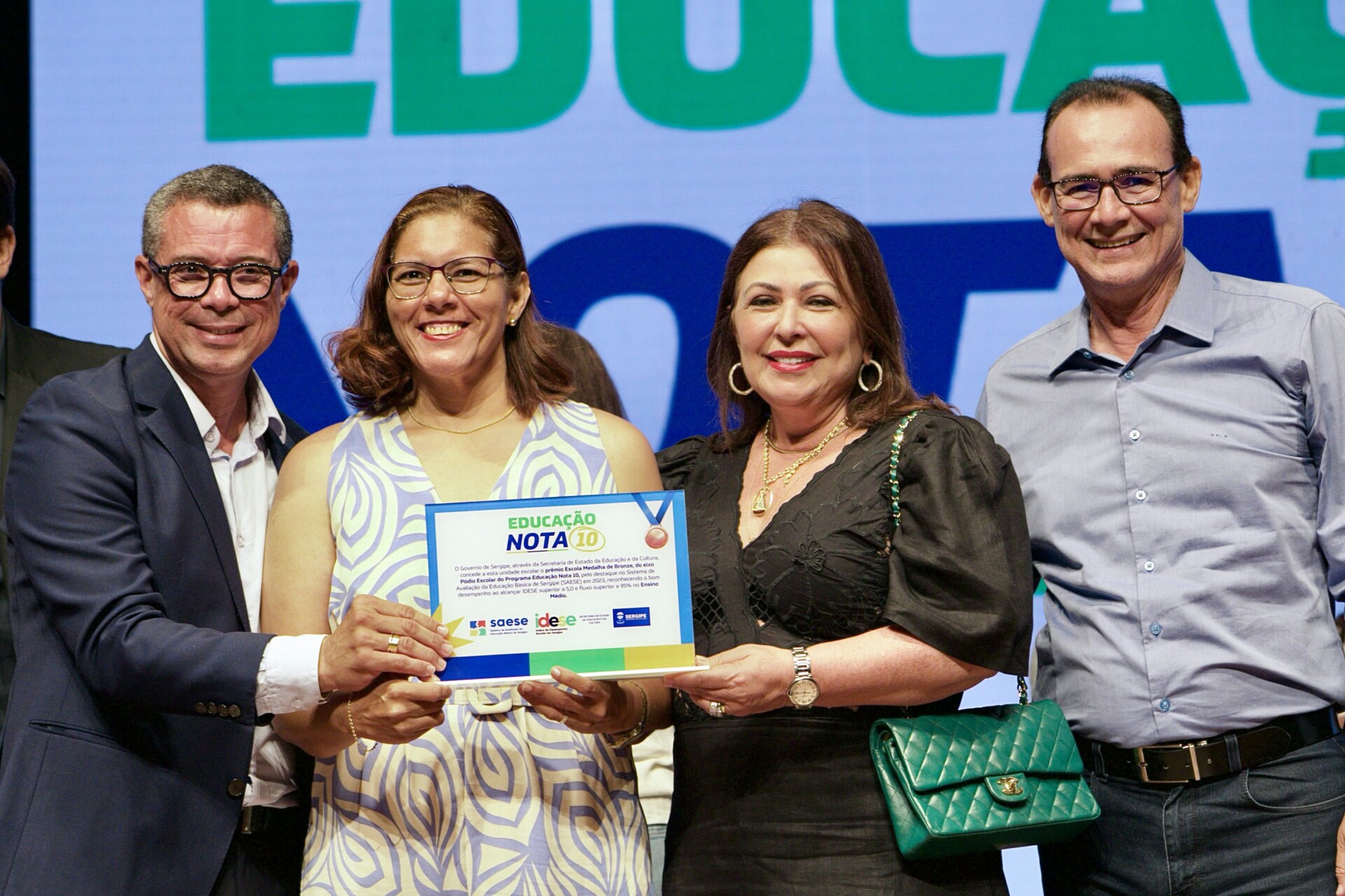 O Programa Educação Nota 10 contempla professores e servidores com base no desempenho obtido pelas escolas e Diretorias de Educação no Sistema de Avaliação da Educação Básica de Sergipe (Saese). Neste ano, foram premiadas as escolas nos eixos Pódio e Avanço Escolar, em quatro etapas: alfabetização, para professores 1º e 2º anos do ensino fundamental e equipe diretiva; anos iniciais do ensino fundamental; anos finais do ensino fundamental; e ensino médio, sendo todas destinadas aos professores e servidores da escola premiada.