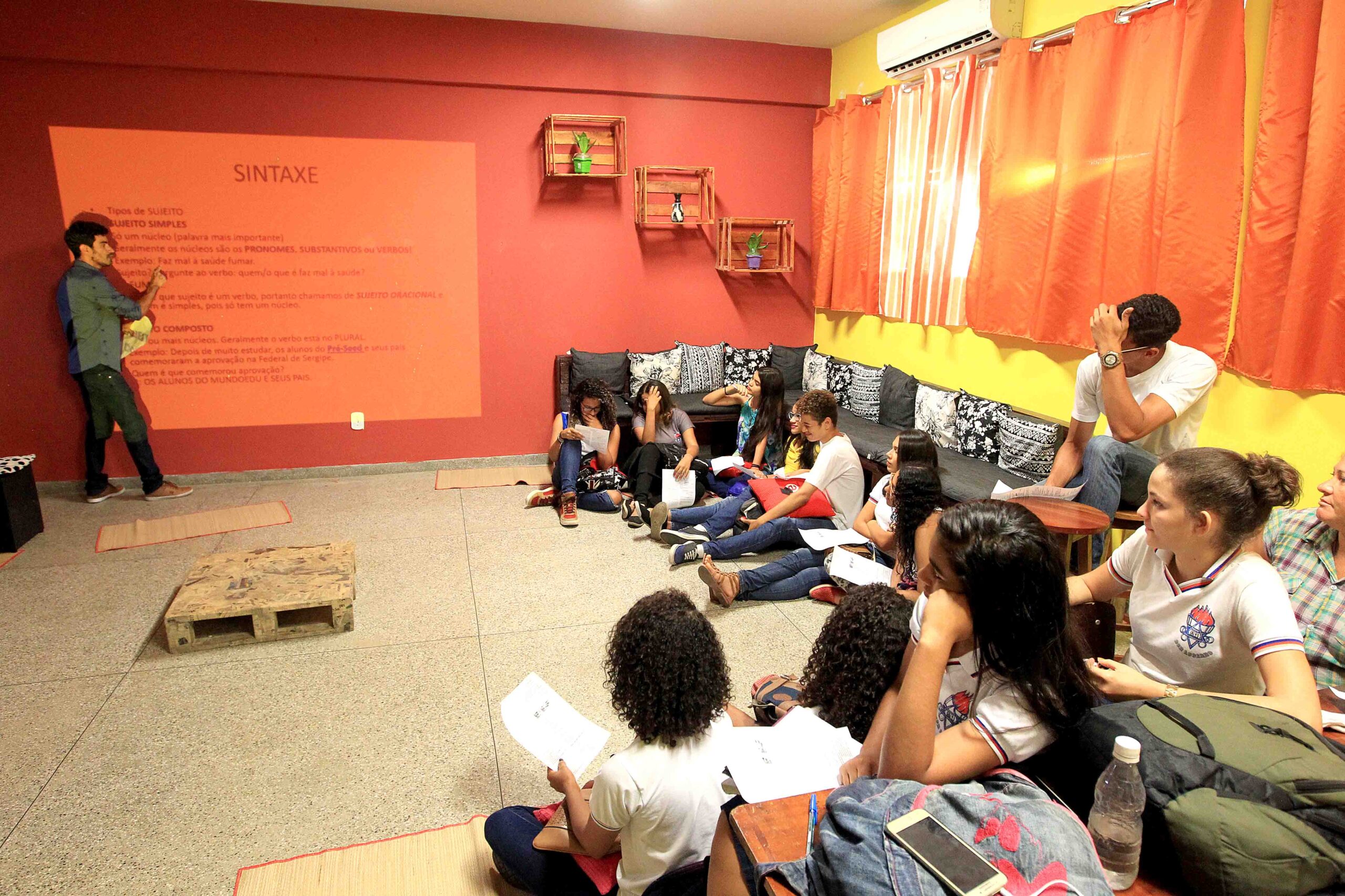 A sala de aula é diferente. Não tem carteiras, tampouco decoração clássica. Nela, os alunos podem sentar em pufes, paletes [plataformas de madeira], cadeiras, tapetes ou até mesmo no chão. Os materiais de estudos são músicas, livros, poesias, peças teatrais e comunicacionais. As paredes fogem do branco ou do cinza. São pintadas de amarelo e vermelho. Os estudantes vão de 15 a 43 anos. O lugar é o ambiente de trabalho do professor de português Fabiano Oliveira, que leciona no Colégio Estadual Dom Luciano Cabral Duarte.
