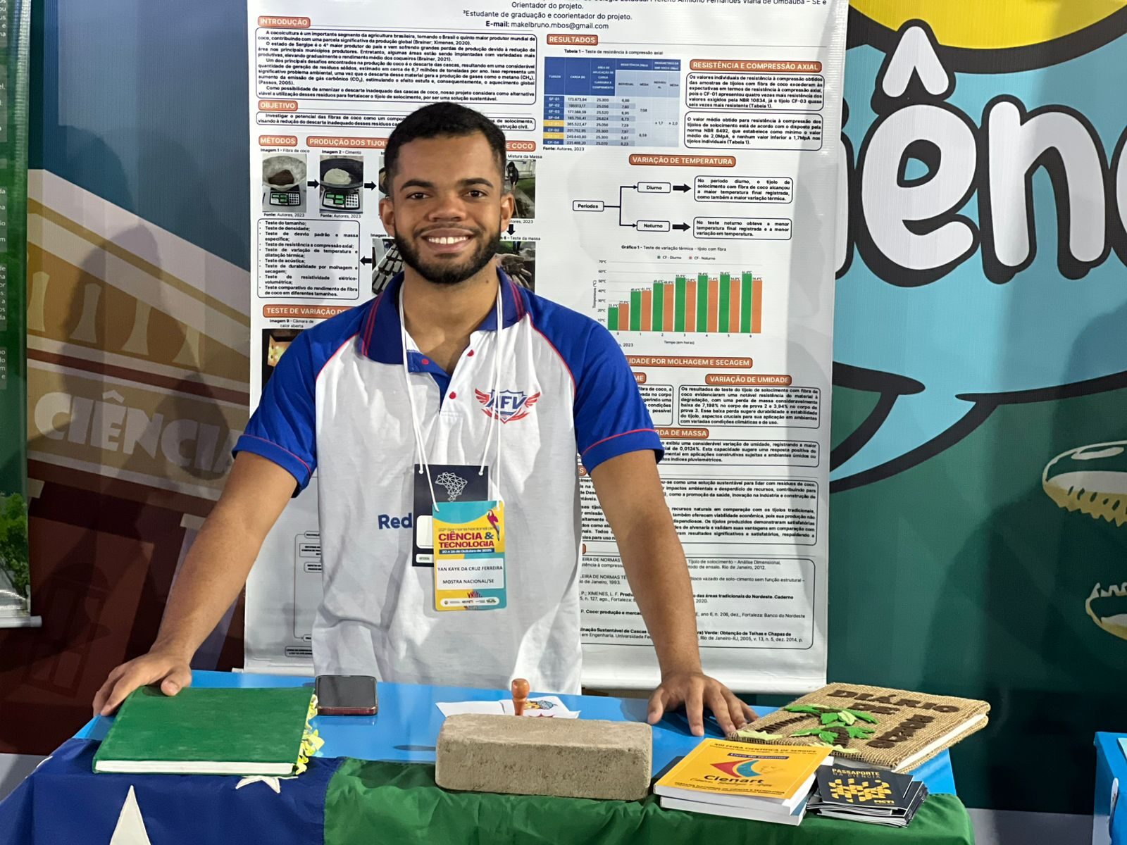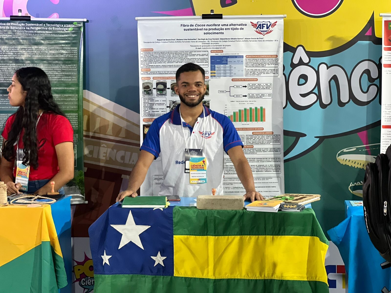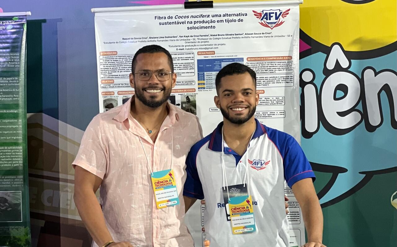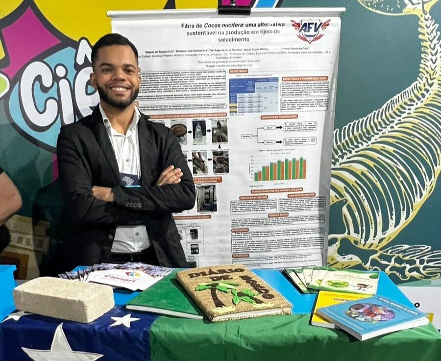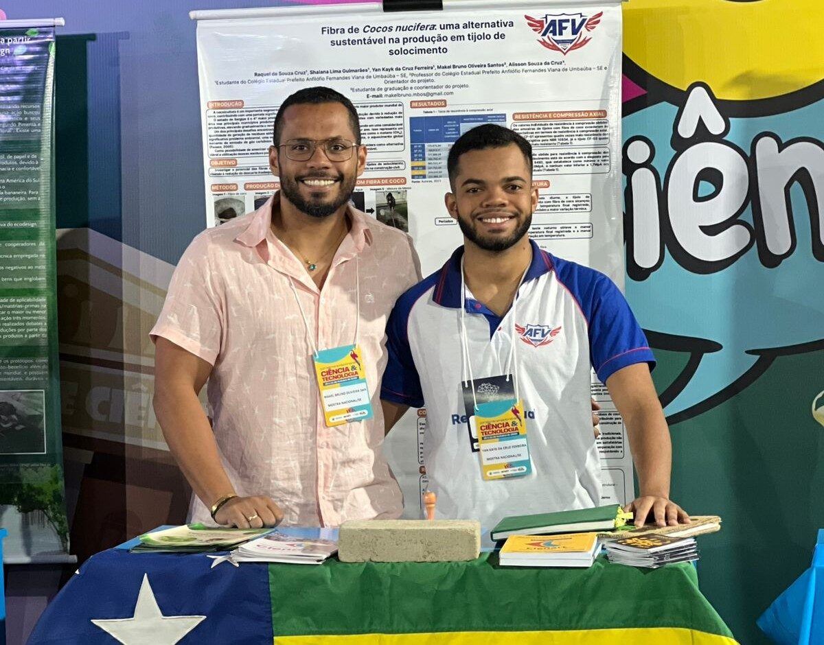 O projeto “Fibra de Cocos nucifera: uma alternativa sustentável na produção em tijolo de solocimento’, desenvolvido no Colégio Estadual Prefeito Anfilófio Fernandes Viana, em Umbaúba, representa Sergipe na 6ª Mostra Nacional de Feiras de Ciências, realizada no período de 21 a 24 de outubro, em Brasília. Orientado pelo professor Makel Bruno Oliveira Santos, com autoria dos alunos Raquel de Souza Cruz, Shaiana Lima Guimarães e Yan Kayk da Cruz Ferreira, o projeto é o único do estado e une-se às pesquisas científicas dos 26 estados brasileiros no evento realizado pelo Ministério da Ciência, Tecnologia e Inovação (MCTI) e Conselho Nacional de Desenvolvimento Científico e Tecnológico (CNPq).