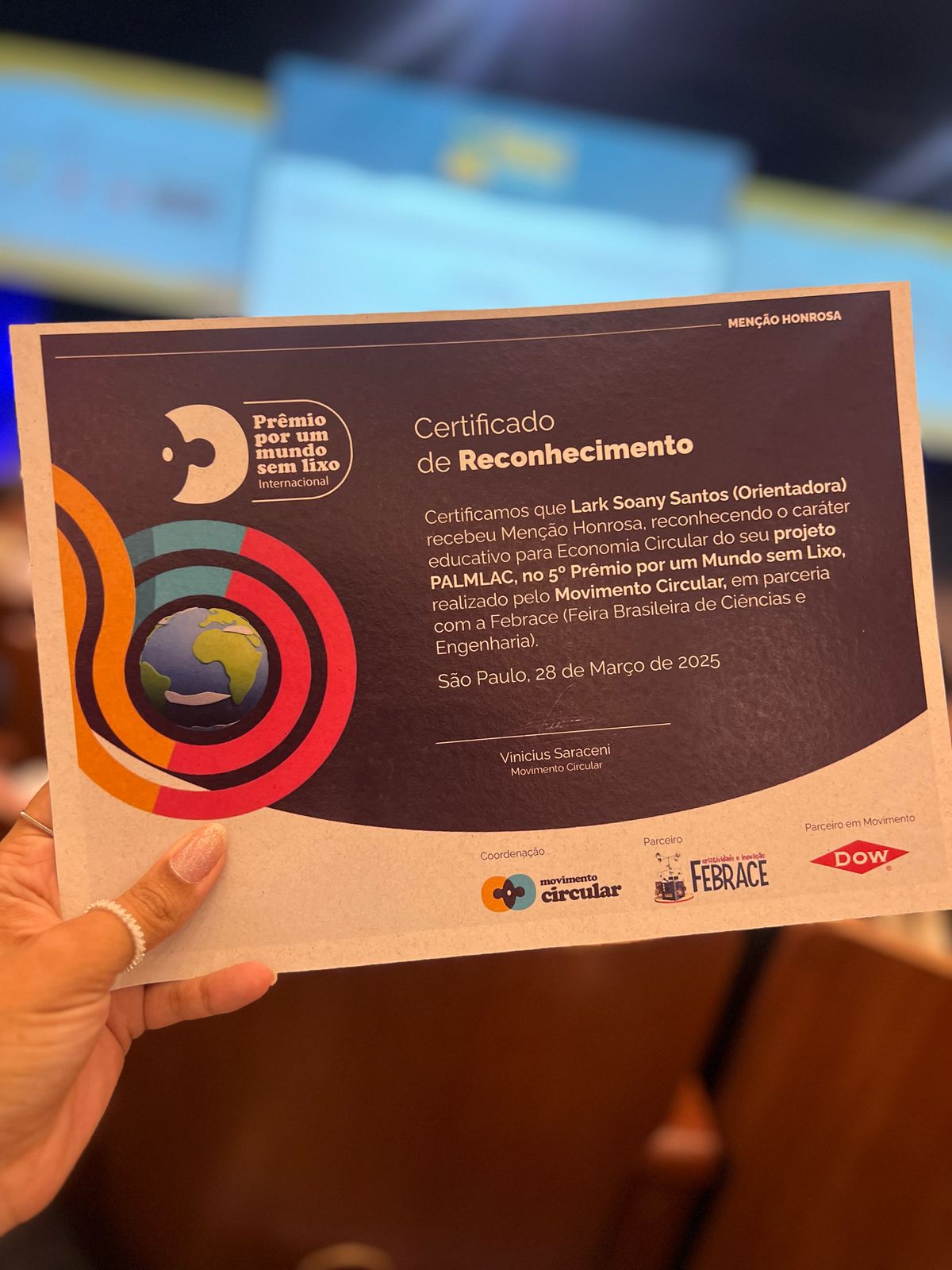Do Centro de Excelência Dom Juvêncio de Britto, as alunas Laura Fernanda e Maria Luiza dos Santos, orientadas pelas professoras Lark Soany e Marisa Gomes, conseguiram que o inovador projeto ‘Palmlac’ ficasse em quarto lugar geral na categoria ‘Ciências Sociais Aplicadas’ e recebesse a Menção Honrosa do prêmio ‘Por um Mundo sem Lixo’, chancelado pelo Movimento Circular, uma entidade que promove a formação e conscientização por um mundo com menos lixo.