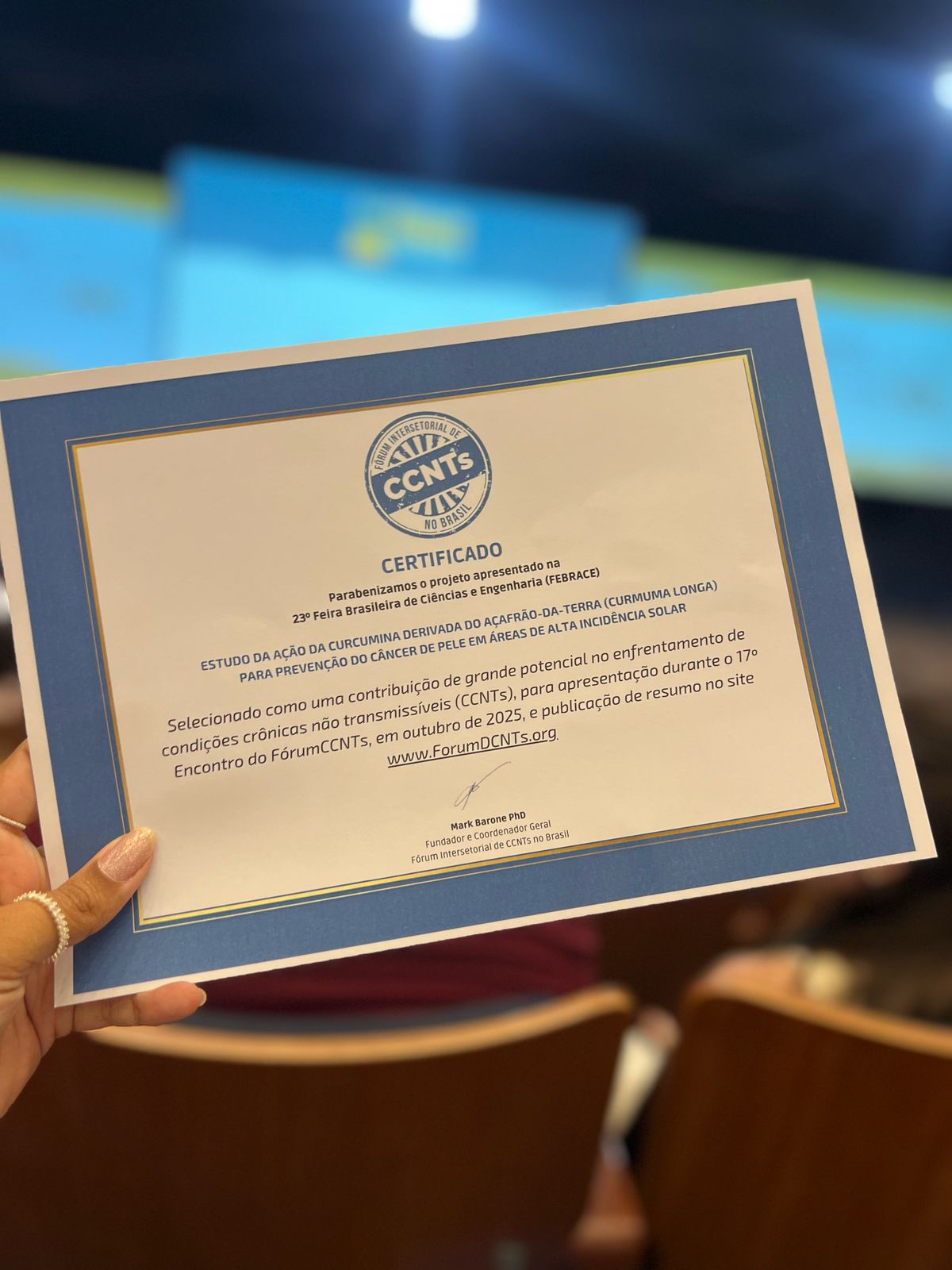 O projeto ‘Estudo da ação da curcumina derivada do açafrão-da-terra (Curcuma longa) para prevenção do câncer de pele em áreas de alta incidência solar’, protagonizado pelos estudantes Ana Clara Alves, Diógenes Felipe Rodrigues e Isabely Tavares, do Centro de Excelência Dom Juvêncio de Britto e do Centro Estadual de Educação Profissional Dom José B. de Castro, sob a orientação das professoras Lark Soany e Marisa Gomes Nobre, subiram ao palco para receber a Menção Honrosa do Prêmio Destaque Fórum CNTs.