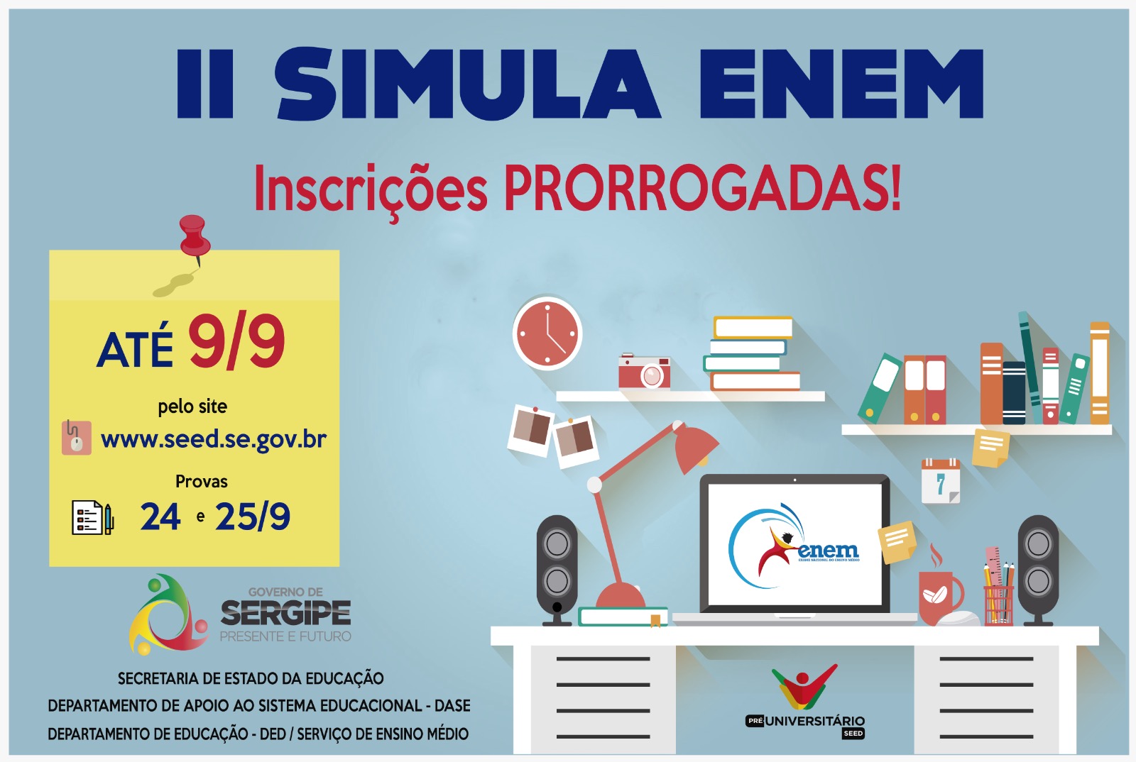O período de inscrição para participar do II Simula Enem foi prorrogado até o dia 9 de setembro. A inscrição é realizada através do Portal da SEED (intranet.seed.se.gov.br/inscricaopreuni) e podem participar todos os estudantes da Rede Pública Estadual matriculados na 3ª série do Ensino Médio, no EJAEM e no Curso Pré-Universitário da Seed.