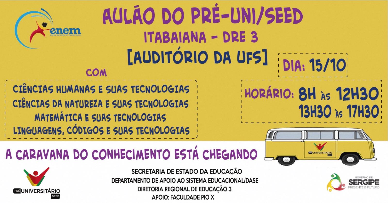 No próximo sábado, 15, será a vez dos estudantes dos 14 municípios circunscritos à Diretoria Regional de Educação 3 (DRE 3), sediada em Itabaiana, região agreste de Sergipe, serem contemplados com mais um aulão de revisão do Pré-universitário da SEED, que, para essa edição, conta com o apoio da Faculdade Pio Décimo.