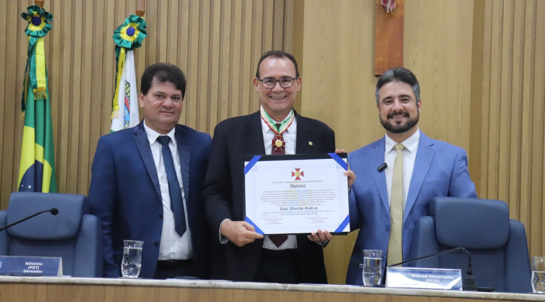 O presidente da CMA, Ricardo Vasconcelos, também utilizou o púlpito para proferir algumas palavras ao homenageado. “Estamos concedendo essa honraria a Zezinho Sobral, não porque ele é o vice-governador, mas porque sabemos do comprometimento dessa pessoa pública e personalidade política de nosso estado, dedicada a melhorar diuturnamente a vida do nosso povo. Saiba, Zezinho Sobral, que a partir de agora você integra um hall dos poucos que receberam esta medalha”, destacou o vereador.