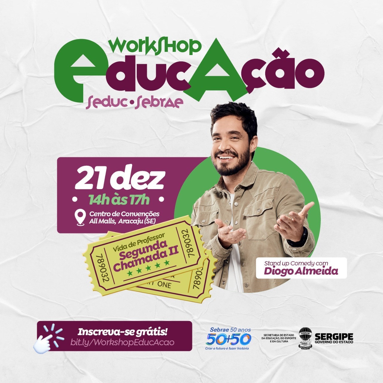 A Secretaria de Estado da Educação, do Esporte e da Cultura (Seduc) e o Sebrae promovem nesta quarta-feira, 21, a partir das 14h, no Centro de Convenções de Sergipe (CIC), em Aracaju, o workshop “EducAção”, no qual ocorrerão apresentações, palestras, entregas de materiais desenvolvidos, certificados, apresentação artística com o comediante Diogo Almeida, que vai apresentar o show de stand-up “Vida de professor”. O evento tem como público-alvo professores, gestores e coordenadores das unidades de ensino da rede estadual. As inscrições devem ser feitas no link: bit.ly/3YwLUIQ.