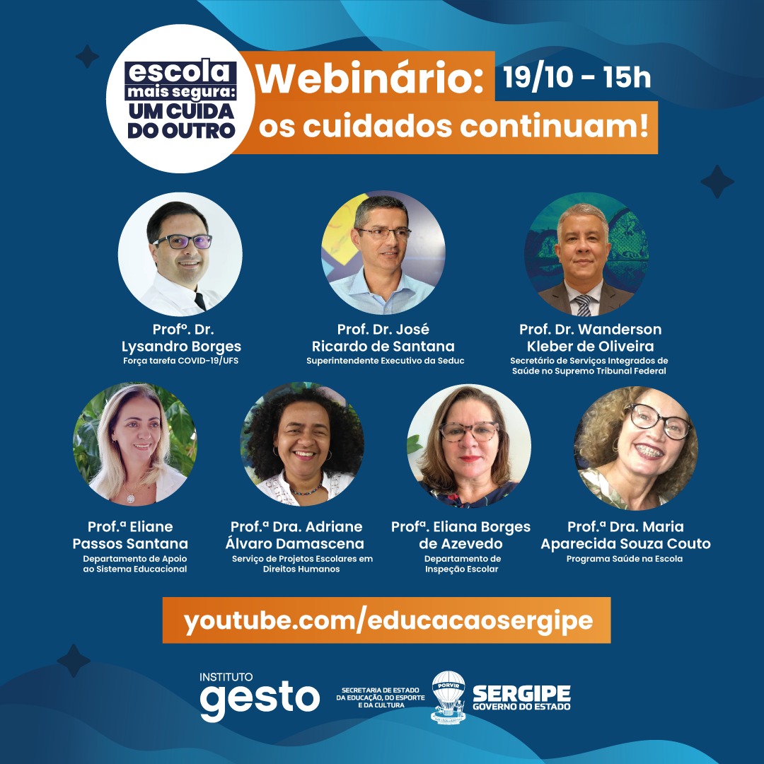 A Secretaria de Estado da Educação, do Esporte e da Cultura (Seduc) realiza na próxima terça-feira, 19, às 15h, o webinário “Escola Mais Segura: os cuidados continuam”, cuja programação contará com a participação de palestrantes convidados e o lançamento do novo formato de monitoramento sanitário que será aplicado nas unidades da rede estadual que retornaram suas atividades presencialmente. O evento será transmitido via canal do YouTube Educação Sergipe.