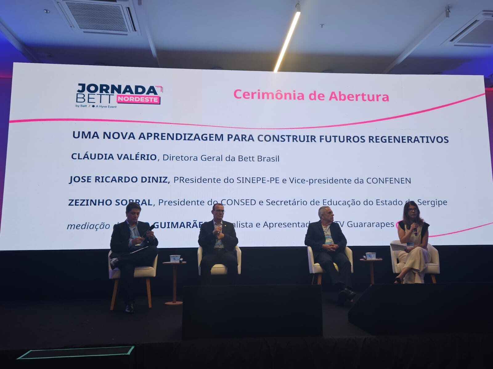 Com o tema ‘Uma Nova Aprendizagem para Construir Futuros Regenerativos’, a iniciativa aborda transformações para uma educação básica cada vez mais sustentável, inclusiva, transformadora e inovadora, capaz de preparar as novas gerações para os desafios do século XXI. Zezinho Sobral compôs o painel que marcou a solenidade de abertura, ao lado de Cláudia Valério, diretora geral da Bett Brasil, José Ricardo Dias Diniz, presidente do Sindicato das Escolas Particulares de Pernambuco, e Ciro Guimarães, jornalista da TV Guararapes.